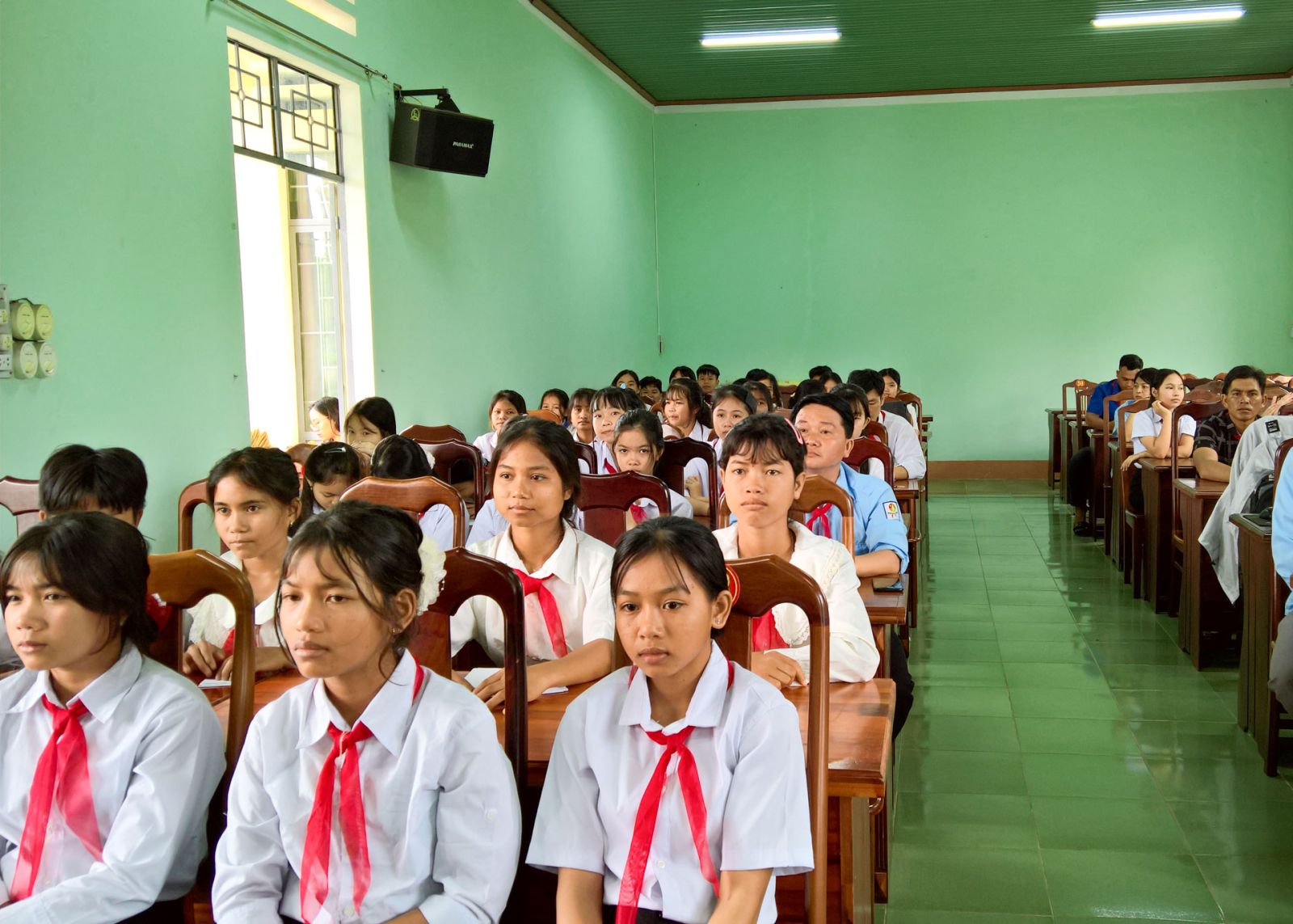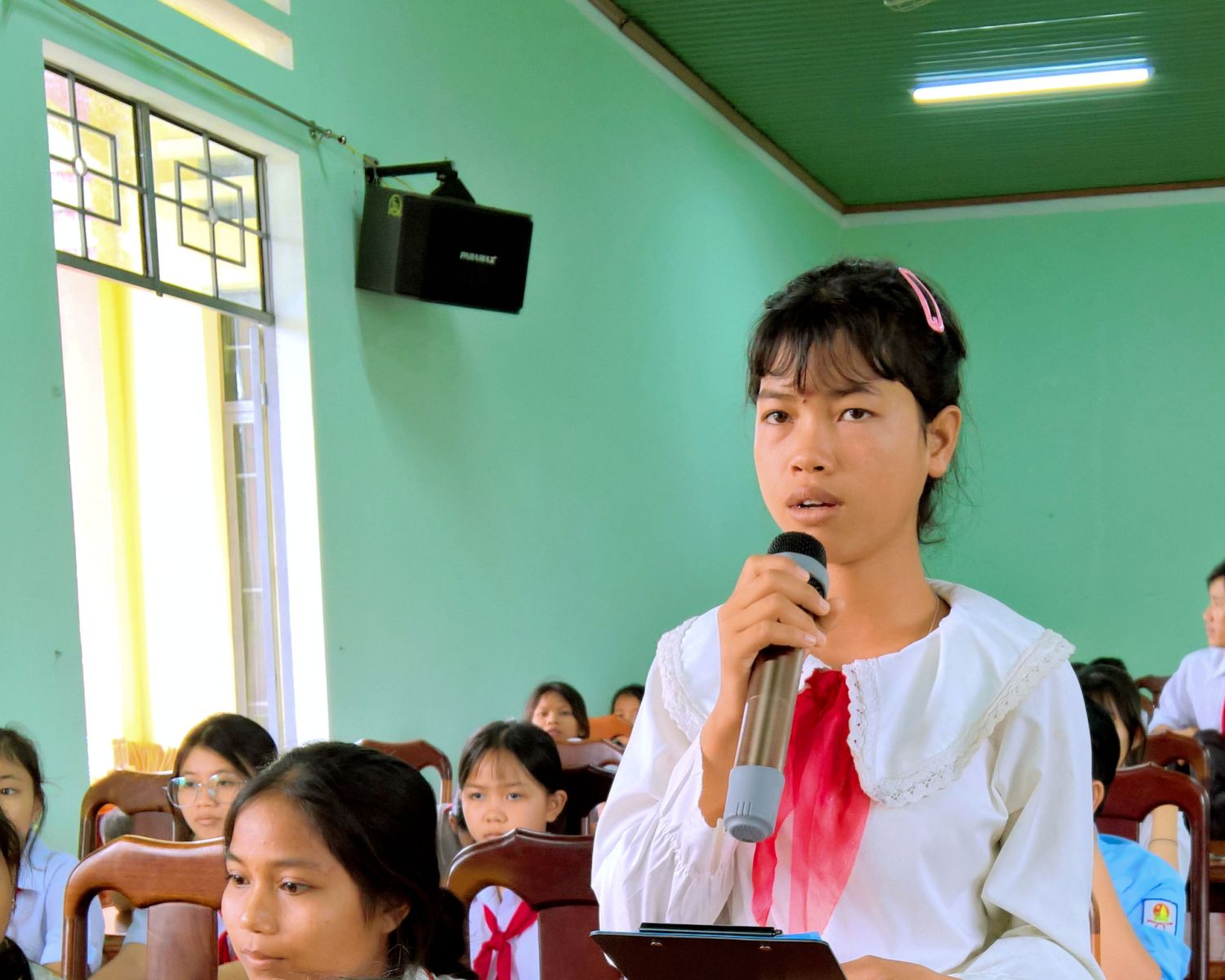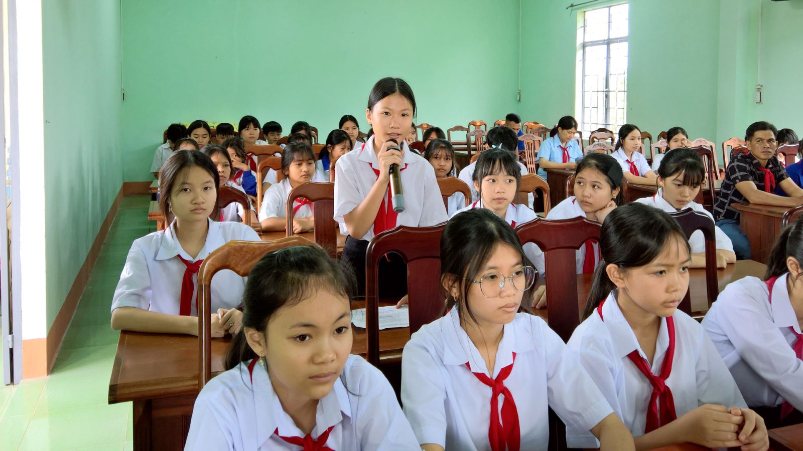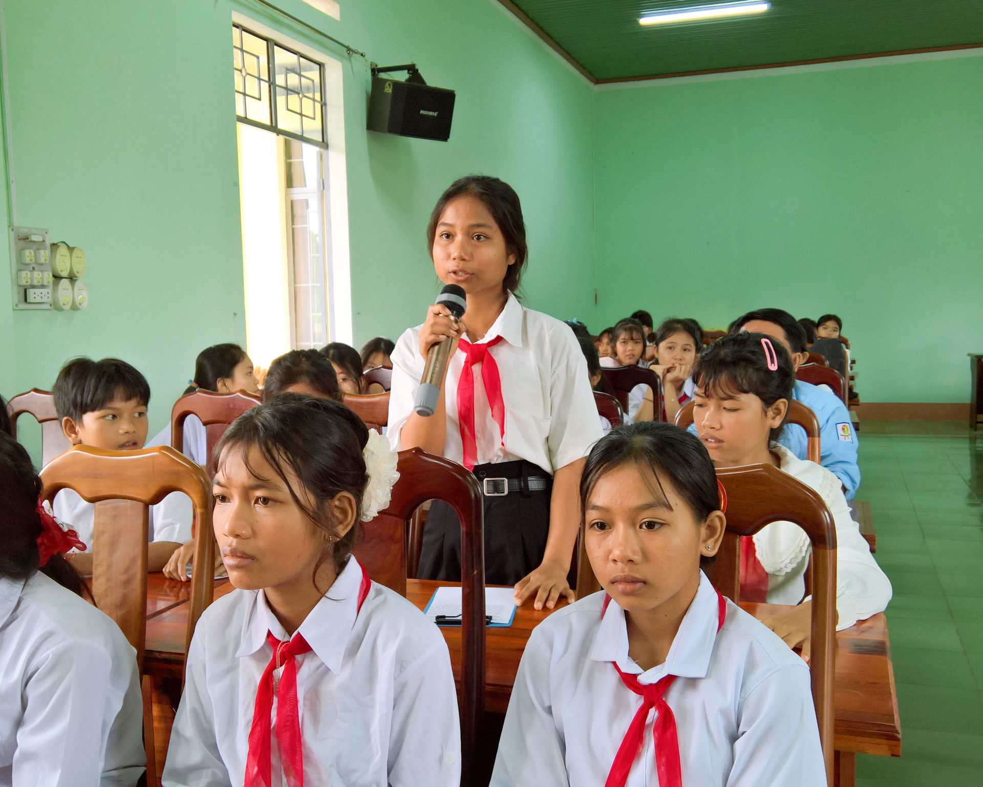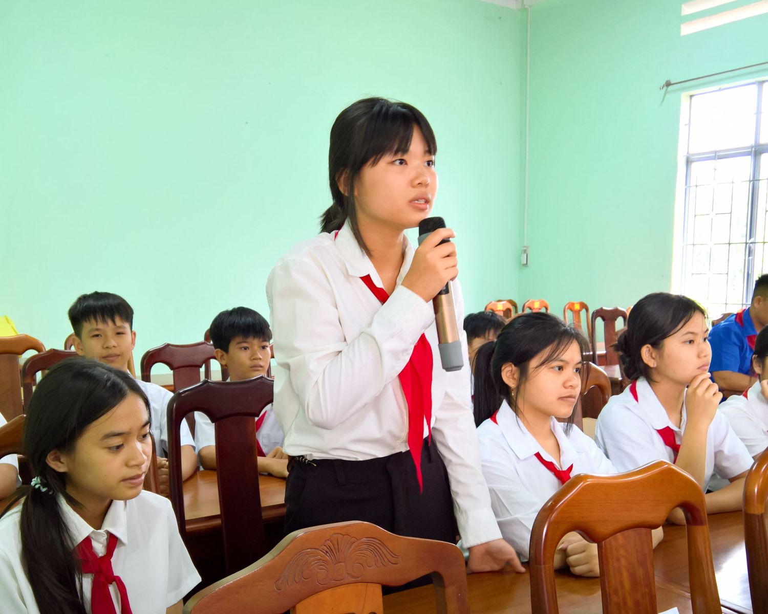 Không khí hội nghị diễn ra sôi nổi, thân thiện và đầy cảm xúc, trên 30 học sinh đại diện cho hơn 650 học sinh bậc THCS của 03 trường trên địa bàn xã đã mạnh dạn đặt câu hỏi, chia sẻ những điều mình quan tâm, từ việc học tập, vui chơi đến những vấn đề xã hội xung quanh. Có bạn mong muốn xã hỗ trợ thêm thiết bị máy tính và lắp đặt mạng để học sinh có điều kiện học tốt hơn. Một bạn bày tỏ lo lắng về chất lượng vệ sinh an toàn thực phẩm của cửa hàng bán bánh kẹo, nước uống đề nghị xã có biện pháp để bảo vệ sức khỏe cho học sinh và người dân. Em Linh Diễm Trang, học sinh lớp 9 thì bày tỏ mong muốn được học bơi để phòng tránh đuối nước, nhưng hiện tại trường chưa có hồ bơi, em hy vọng xã sẽ quan tâm xây dựng hồ bơi để các bạn có thể học bơi an toàn. Có bạn phản ánh tình trạng học sinh bị dụ dỗ đi làm thuê trong mùa vụ, ảnh hưởng đến việc học và sự phát triển của các bạn, mong muốn xã có biện pháp ngăn chặn và hỗ trợ học sinh có hoàn cảnh khó khăn. Ngoài ra, có bạn đề xuất xây dựng thêm sân chơi, công viên nhỏ hoặc khu thể thao cộng đồng để sau giờ học các bạn có nơi vui chơi lành mạnh, rèn luyện thể chất và kỹ năng sống. Những ý kiến này không chỉ thể hiện sự quan tâm của các bạn học sinh đến môi trường sống và học tập của mình, mà còn cho thấy tinh thần trách nhiệm và mong muốn được đóng góp xây dựng quê hương ngày càng tốt đẹp hơn.
